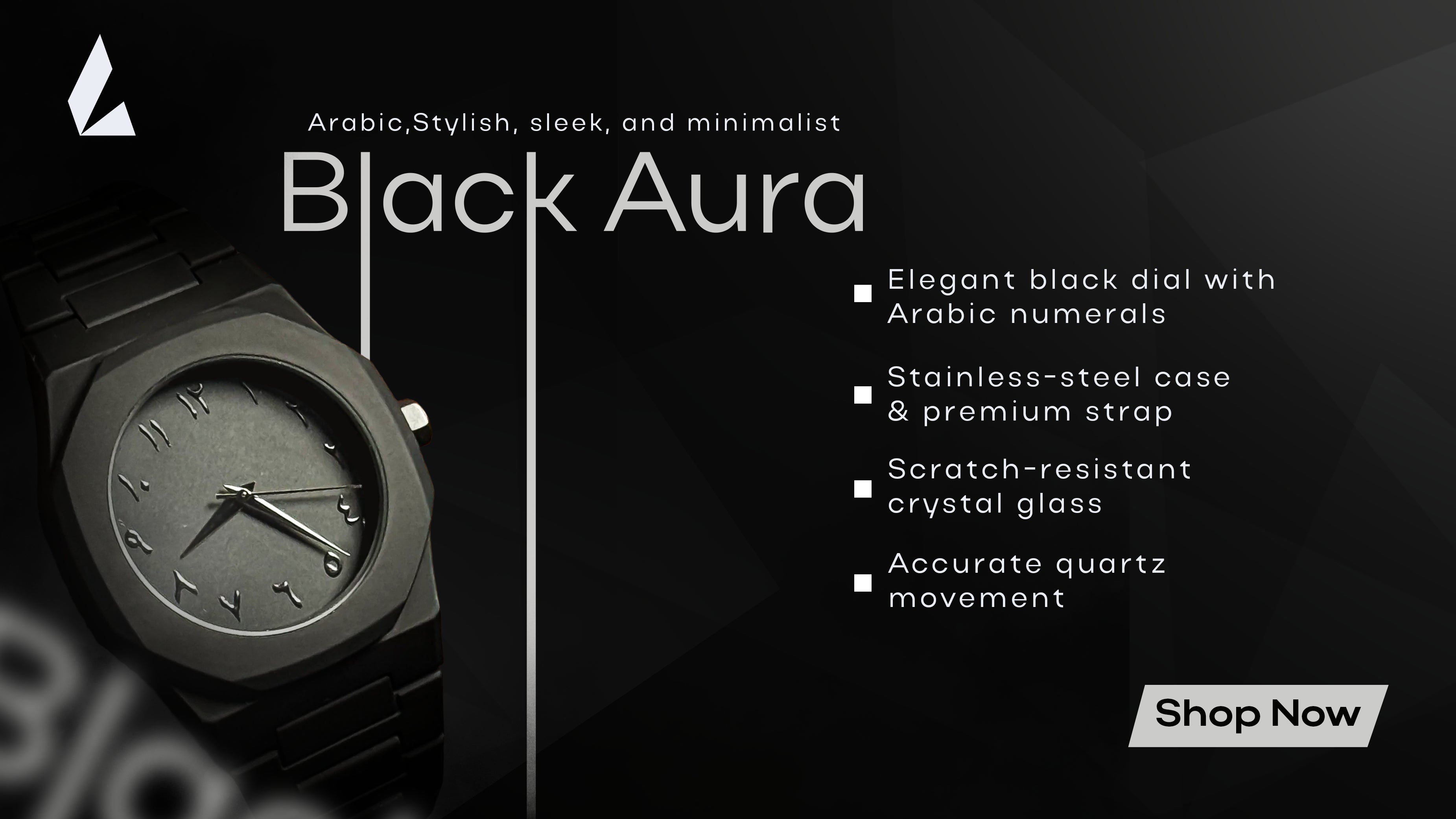 The Black Aura Arabic Watch blends modern design with timeless elegance. Its black dial and Arabic numerals add a refined cultural touch.